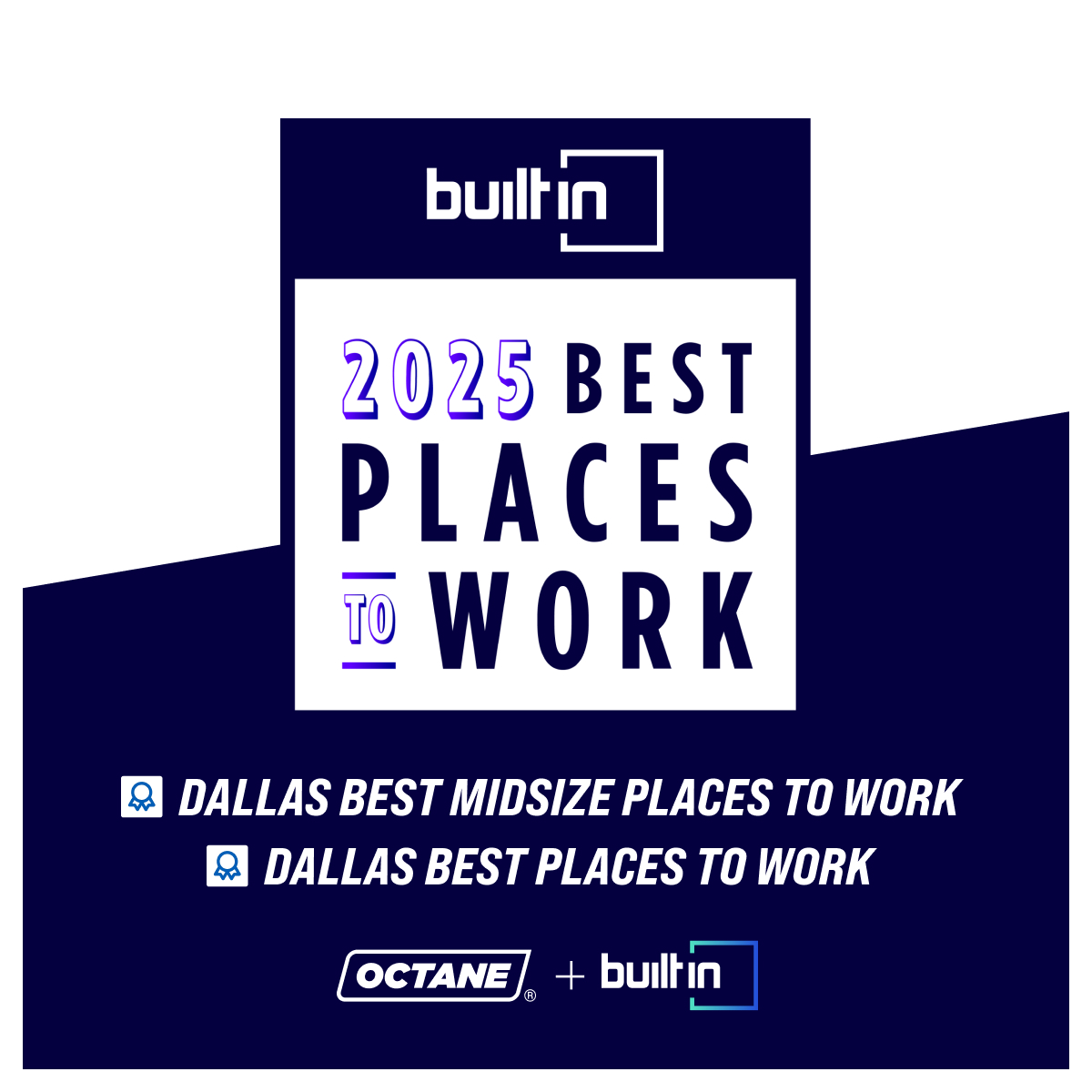 Octane was named to Built In's list of Best Places to Work - Dallas and Best Midsized Places to Work - Dallas for its culture, commitment to employee development, and benefits.